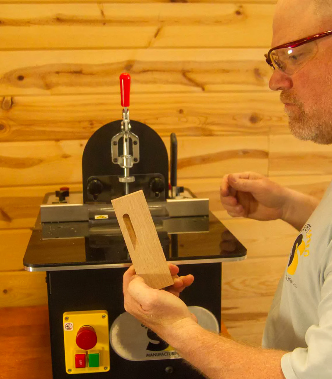 The SPM101EZ  screw pocket machine drills a pilot hole while machining a six degree screw pocket with dual routers and an easy action lever. An “EZ” action lever allows operators to pocket as material allows in two movements, without the need for finding a neutral position.